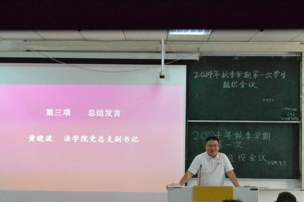 本网讯记者 袁本怡/文 谭正法/图 )2024年9月5日,我院于德智楼9B301教室召开2024年秋季学期第一次学生组织会议。法学院学生会、公寓管理委员会、团总支、通讯社的全体学生干部参与会议,法学院党总支副书记黄晓波、学生党支部书记彭阳出席会议,团总支书记谢学婧主持会议。