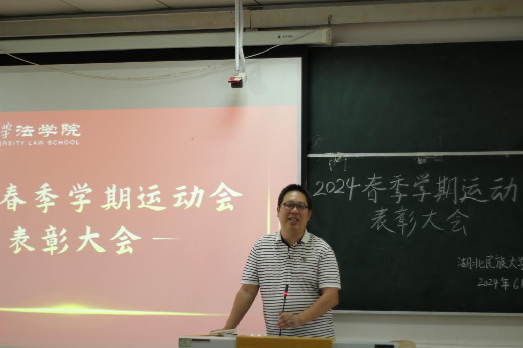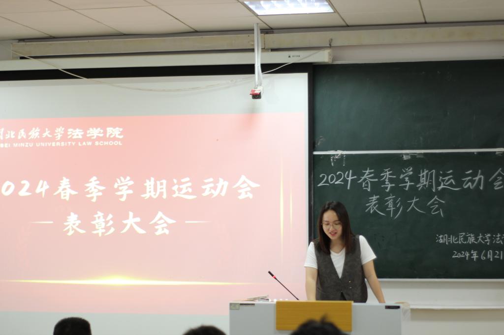 本网讯(记者 林真佳/文 谭正法/图)6月21日,我院于9B301教室召开2024年春季学期运动会表彰大会。法学院党总支书记张明波、党总支副书记黄晓波、学生科科长阙嘉苗出席会议。会议由团总支书记谢学婧主持,百余名运动员和工作人员参加大会。