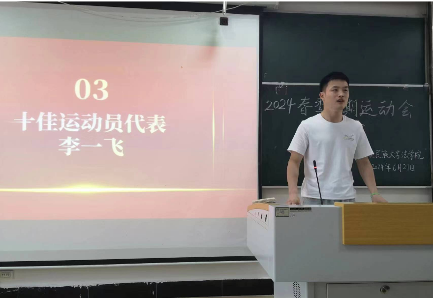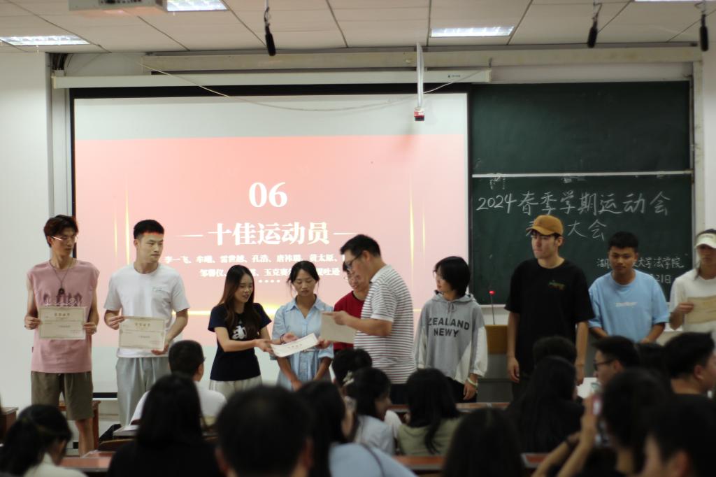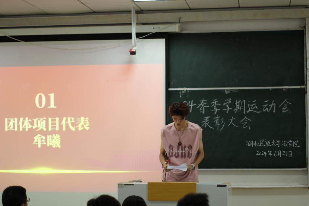 大会伊始,老师与学生一同观看法学院运动会剪辑短片,回顾精彩瞬间。接着,阙嘉苗老师宣读运动会表彰人员名单并邀请运动员与工作人员代表发言。牟曦、苏麦亚·孜比布拉、李一飞分别作为团体项目代表、突出贡献代表、十佳运动员代表,表达了对全体运动员和工作人员的感谢对法学院的热爱。随后,老师们为获奖学生颁发荣誉证书。最后,张明波书记进行总结发言,对获奖学生表示祝贺,希望今后同学们可以保持佳绩,再创辉煌。