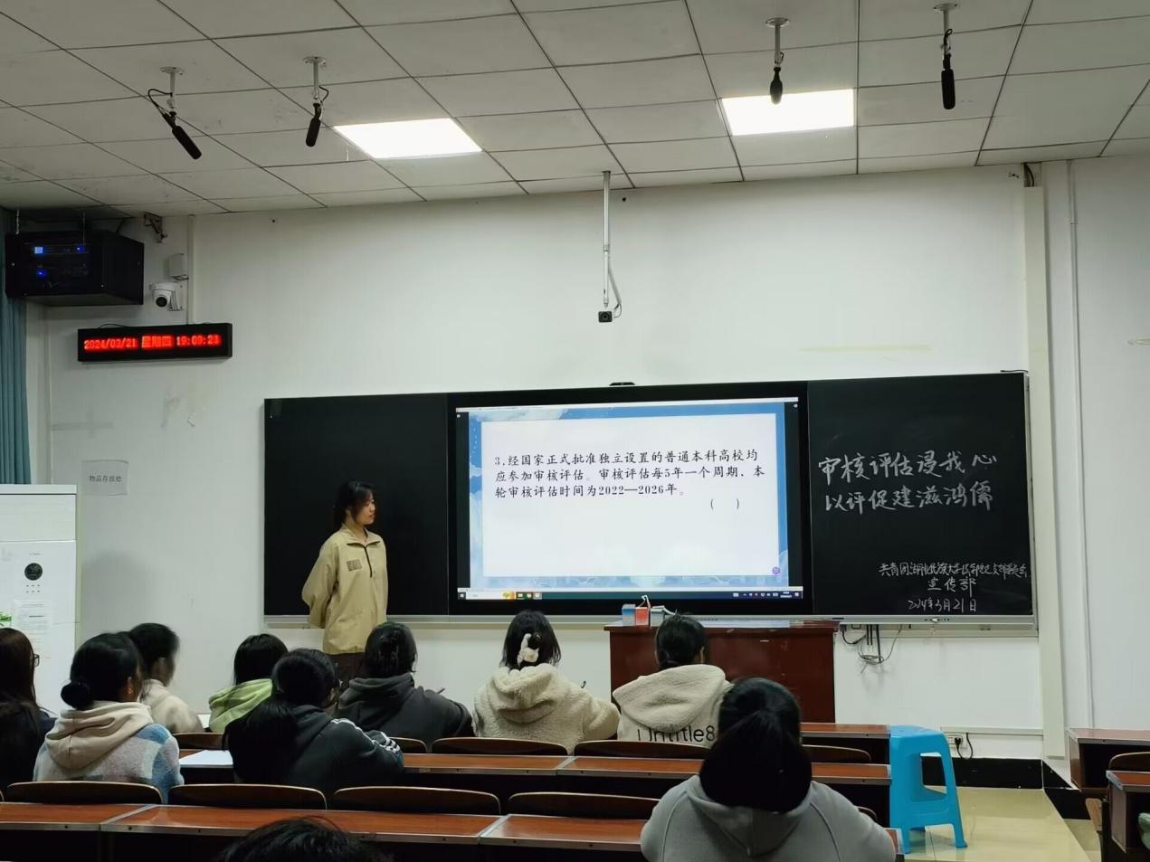 本网讯(朱晋/文 刘李丹/图)为深入宣传党的教育方针,迎接新一轮教育教学审核评估工作,引导全院学生全面认识本科教育教学审核评估工作的重要意义,将小我的发展融入学院的大发展之中,我院于2024年3月21日在德智楼9B306教室举办了主题为“审核评估浸我心,以评促建滋鸿儒”的审核评估知识竞赛活动。