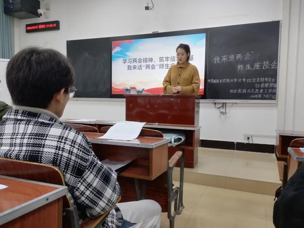 谢学婧老师就2024年政府工作报告及两会热词进行解读,并鼓励大家就相关内容进行交流和讨论。崔钰婕等学生分别就“离线休息权”“放心消费行动”等话题分享了自己的见解,引发了同学们的共鸣。谢学婧老师进行座谈会总结发言,强调学习两会精神、筑牢理想信念的重要性,并结合国家需要、学校发展、个人职业规划对与会人员提出殷殷期盼。