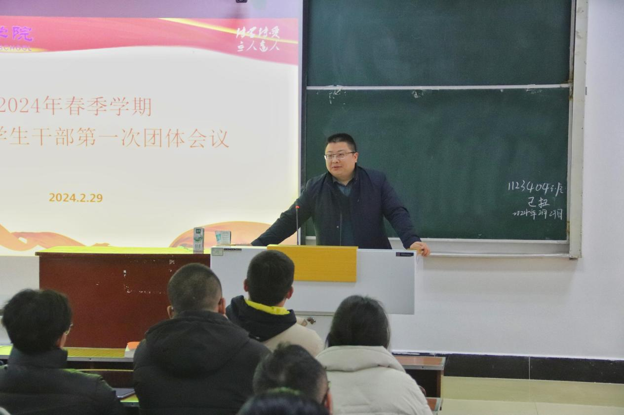 本网讯(见习记者 安阳/文 记者 黄煜基/图)2024年2月29日,我院于德智楼9B301教室召开法学院2024年春季学期学生干部第一次团体会议。法学院学生会、公寓管理委员会、团总支、通讯社的全体学生干部参与会议,党总支副书记黄晓波、学生科科长阙嘉苗、学生党支部书记彭阳出席会议,团总支书记谢学婧主持会议。