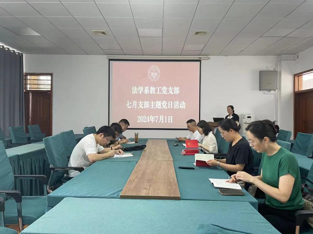2024年7月1日,法学系教工党支部在德智楼9B314开展以“学党史、明党纪”为主题的7月主题党日活动。