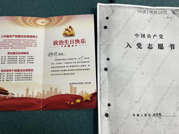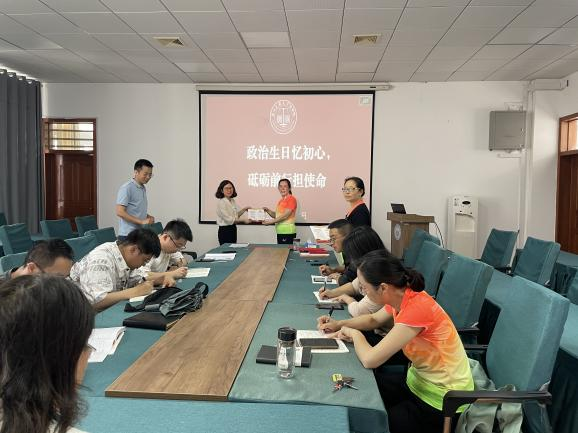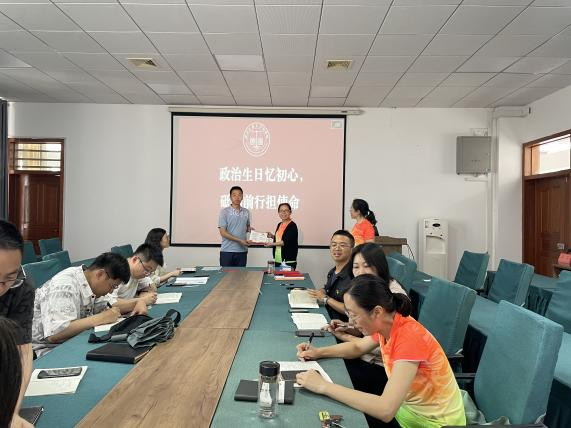 在特色实践环节,法学系教工党支部以“政治生日忆初心,砥砺前行担使命”为主题,集中为5月份入党的教职工党员冉艳辉同志和柳海松同志过“政治生日”。冉艳辉同志和柳海松同志分别回忆了入党初心,分享了入党感悟。冉艳辉同志表示,入党24年,再次回望初心,意义重大。自大学以来自己即以一名优秀共产党员的标准要求自己,献身于社会主义现代化建设、社会主义法治建设,回望初心,无怨无悔,今后会更加坚定前行。柳海松同志表示,自15年前加入中国共产党以来,无论在生活还是工作上,自己都一如既往地坚守初心从未改变,在接下来的人生岁月里,他也会继续努力,力争为党的事业,为法学院的事业贡献自己的力量。法学系教工党支部为冉艳辉同志和柳海松同志送上党员政治生日贺卡,为他们的政治生日表达了真诚的祝福。