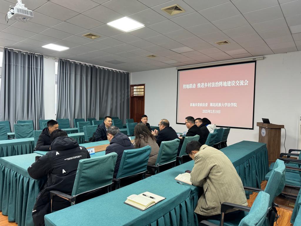 2月19日,恩施市委常委、政法委书记李华军,恩施市司法局副局长向成义、恩施市委政法委政治处主任龚清新一行莅临我院开展“校地联动推进乡村法治阵地建设交流活动。学校党委常委、纪委书记张宏磊,学校党委委员、研究生部(处)部(处)长、学科建设与学位管理办公室主任汪燕学院党总支书记张明波副院长李文革党总支副书记黄晓波,副院长蔡世鄂,知识产权研究中心主任杨信等参加了本次交流活动。