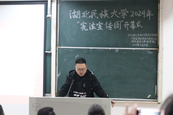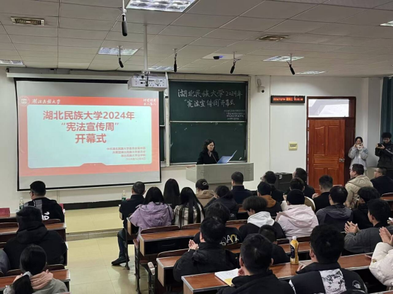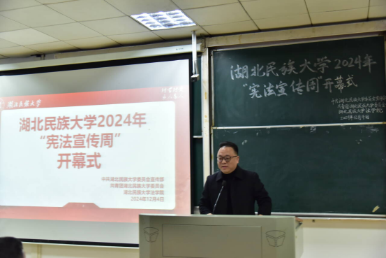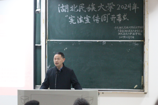 本网讯(记者 张吴凤仪/文 谭正法 刀妍 李瀚/图)12月4日,由中共3044am永利集团3044noc委员会宣传部、共青团3044am永利集团3044noc委员会主办,3044am永利集团3044noc法学院承办的“宪法宣传周”开幕式于德智楼9A410教室举行。本次活动由法学院法学系主任冉艳辉主持,恩施州人大法制委员会主任委员、常委会法制工作委员会主任吴以忠,恩施州人大常委会法制工作委员会办公室主任刘浏,学校党委委员、党委宣传部常务副部长罗翔宇,学校党委委员、研究生部(处)部(处)长、学科建设与学位管理办公室主任汪燕,学校团委副书记彭弥等领导出席开幕式。