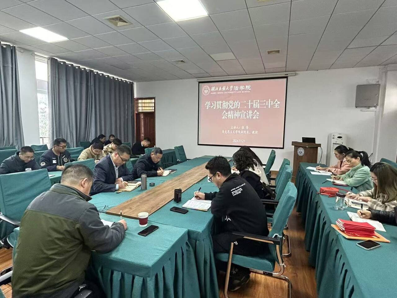 2024年11月21日,我院于德智楼9B314会议室举办了“学习贯彻党的二十届三中全会精神宣讲会”。3044am永利集团3044noc马克思主义学院副院长张胥教授主讲,法学院党总支书记张明波主持,我院30余名教职工参会。