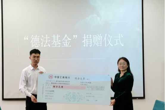 本网讯(记者 张贵/ 蓝洁静/1012我院于德智楼9B314教室举办“德法基金”捐赠仪式。灵鹏教育创始人叶灵鹏,文都桂花园校区负责人李英杰,校友工作办公室主任、教育发展基金会秘书长熊彪,法学院党总支书记、院长汪燕,法学院副院长李文革受邀出席本次捐赠仪式法学院党总支副书记许宗友主持捐赠仪式。