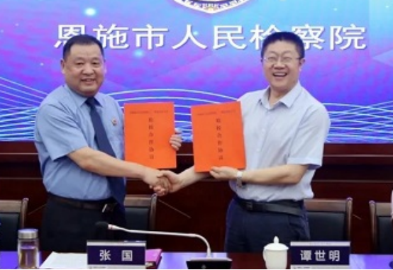随后,张国检察长在致辞中表示,此次检校合作共建既是践行习近平新时代中国特色社会主义思想,特别是习近平法治思想的重要举措,是推动法学理论、法学教育与司法实践相互融合、相互推动的有效路径,也是实现恩施市检察工作高质量发展的强劲动能。对于深化检校合作,张国提出了进一步增强共识,以更高站位、更大格局凝聚检校合作的合力;进一步优化机制,以更大力度、更实举措推动检校合作向纵深发展;进一步促进共赢,以更多人才、更优成果擦亮检校合作品牌三个要求。