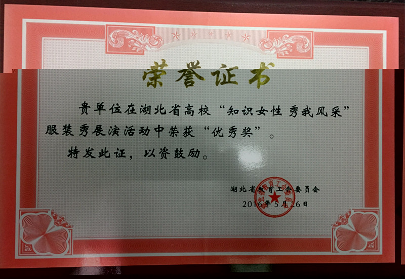 2016年5月26日,永利官网代表队参加湖北省高校“知识女性 秀我风采”服装秀展演荣获“优秀奖”。
