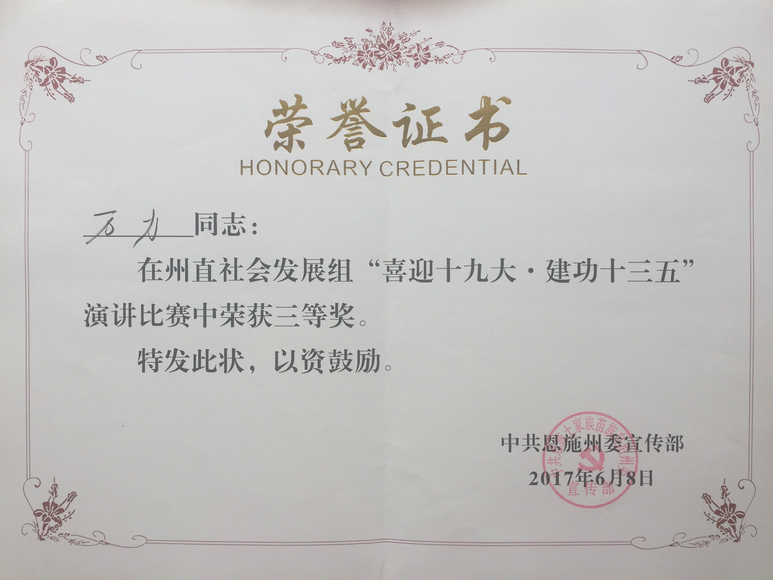永利官网万力老师在州委宣传部、州委州直机关工委、州总工会联合举办“喜迎十九大.建功十三五”演讲比赛中荣获社会发展组三等奖。