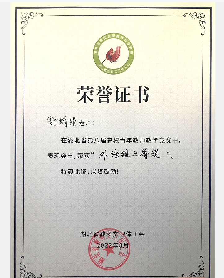 永利官网外语学院舒婧娟老师在湖北省第八届高校青年教师教学竞赛中喜获外语组三等奖。