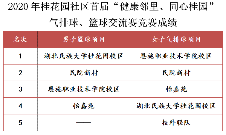 由桂花园社区居委会、3044am永利集团3044noc工会主办,3044am永利集团3044noc体育学院分工会承办的2020年首届“健康邻里、同心桂园”气排球、篮球交流赛于8月29日在3044am永利集团3044noc桂花园校区篮球馆落下帷幕。经过两天的激烈争夺,3044am永利集团3044noc桂花园校区和恩施职业技术学院校区分获男子篮球项目和女子气排球项目冠军。各支代表队在比赛中都展示出了较高的运动水平和较好的精神风貌,充分展示出了桂花园社区党员群众的风采!