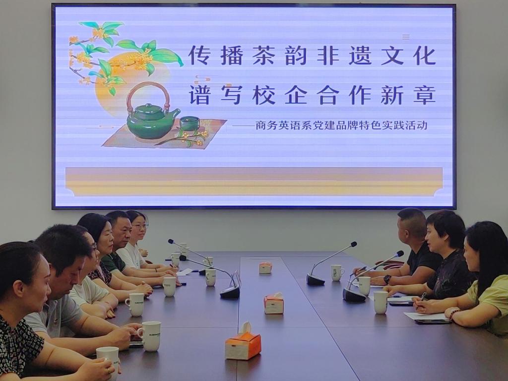 在活动期间,商务英语系教师与公司主要负责人就恩施茶文化传承与发展、产学研活动开展与融合、专业人才素质与能力、学生实践与就业等方面进行深入交流。随后,学院党总支书记工会主席罗成富、润邦公司副总经理谭书玲、商英系主任秦为民、实习实训中心主任王军等一同出席校企合作签约暨授牌仪式。