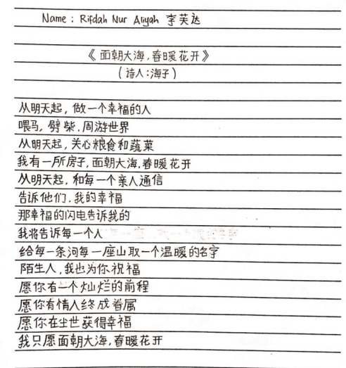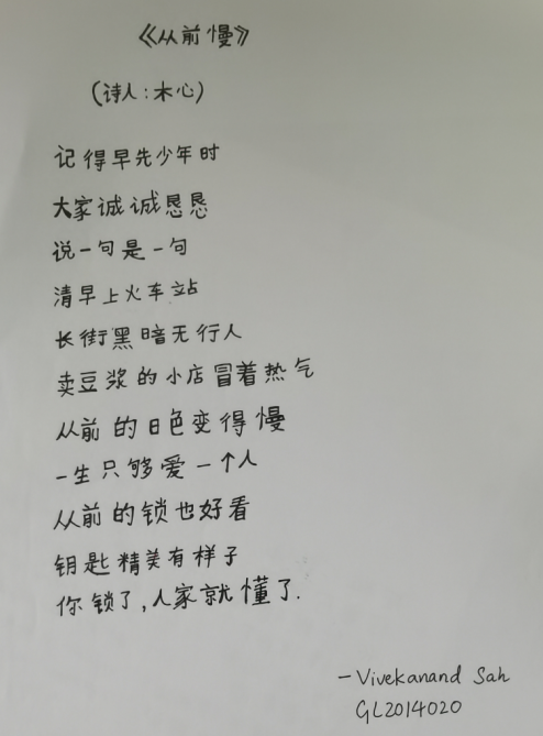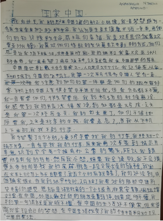 2020年6月5日—7月5日,我院举办了留学生汉字书写线上比赛。参赛学生或手抄自己喜欢的中国诗词,如《面朝大海,春暖花开》《从前慢》等,或记述自己与中国的故事,在感受中国语言文字的魅力与书写汉字的乐趣中锻炼自己的中文能力,涵养文化素养。本次比赛共评选出一等奖2名,二等奖4名,三等奖6名,对鼓励学生手写汉字、写对汉字、写好汉字,提高汉字书写能力和汉语水平有较好的推动作用,同时,也有利于丰富学生课余生活、增强学习他们的学习信心,营造良好的学习氛围。