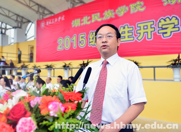 学校领导戴小明、顿祖义、韩思懿、汪兴平、李清政、邓磊、祝建波,恩施军分区参谋长向代祥,科技学院党委书记丁莉、院长刘杰书以及学校各单位负责人在主席台就坐。学校党委副书记顿祖义主持开学典礼。学工处处长唐敦双在开学典礼前介绍主席台领导。