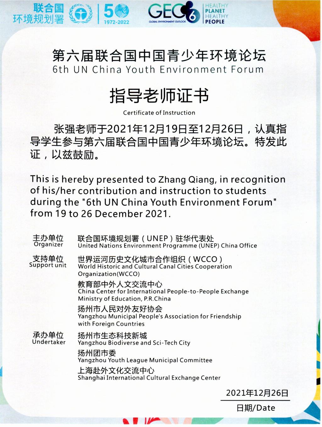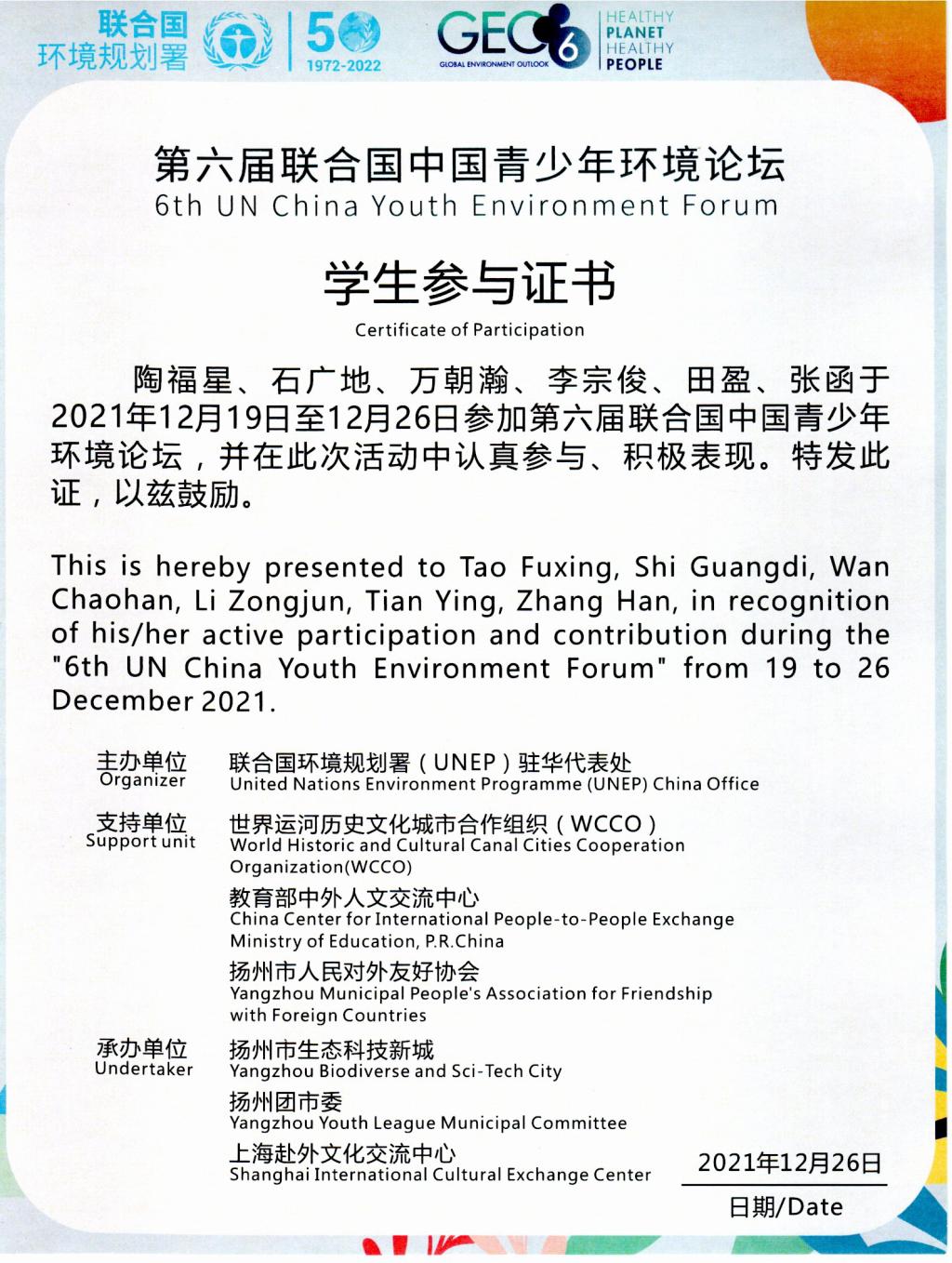 永利官网学生参加“第六届联合国中国青少年环境论坛”