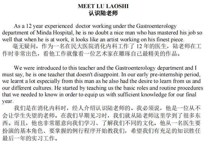 临床实习是医学教育体系中的重要组成部分,优质的临床师资力量是保障临床教学质量的关键。此次征文活动从留学生的视角展示了民大医院留学生带教老师们的专业、敬业、兢兢业业、以身作则、乐教善教的良师风采,也展现了永利官网留学生勤学好问、严谨踏实、全心全意为患者服务的良好风貌。