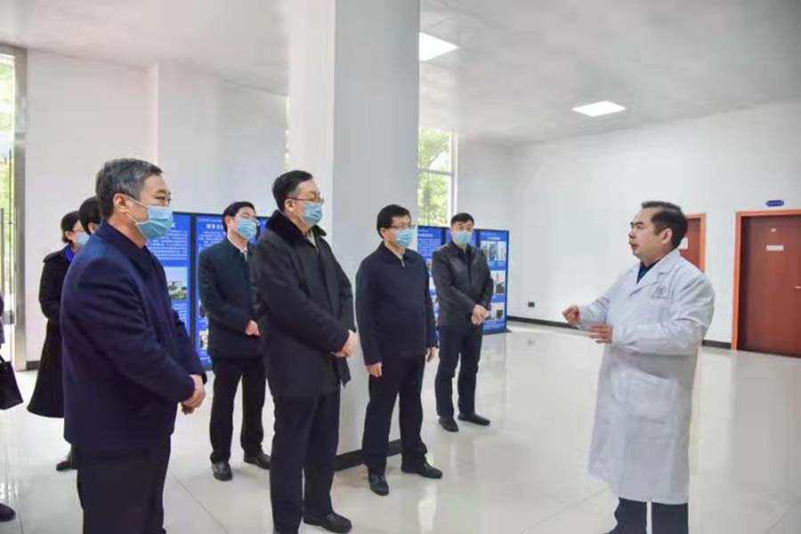 颜益志(右一)向教育部副部长田学军等介绍武陵山中药材检验检测中心情况