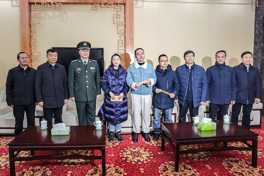 胡超文(右三)、向前进(右二)、柯东海(右一)、龚鸿斌(左三)、单艳平(左二)、苏勇(左一)与师生代表合影