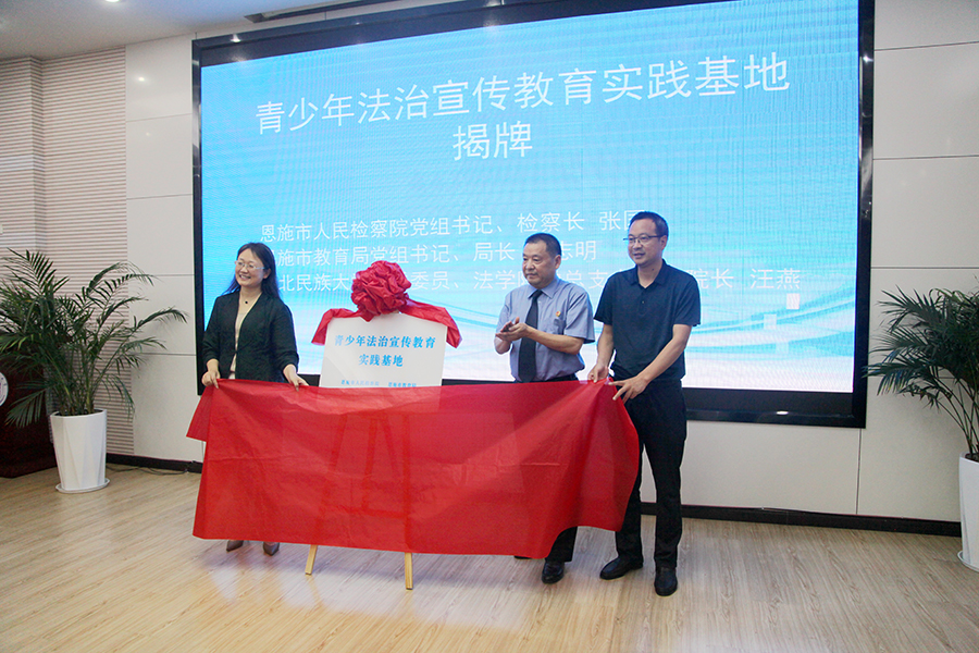 7月13日,由3044am永利集团3044noc与恩施市人民检察院、恩施市教育局三方共建的青少年法治宣传教育实践基地揭牌仪式在学校行政楼三号会议室举行,学校党委常委、副校长李军出席揭牌仪式并讲话。