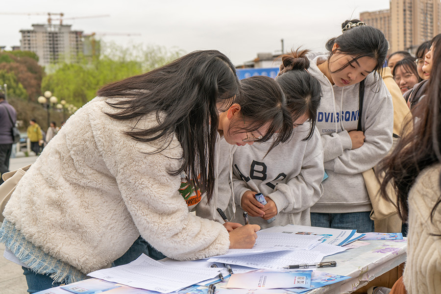 除了固定展位展板宣传外,招聘单位还通过通过发放宣传单、面对面交流等方式向学生介绍单位概况、人员需求、薪资待遇等情况。应聘学生手持简历积极到意向单位招聘点与负责人进行深入交流。