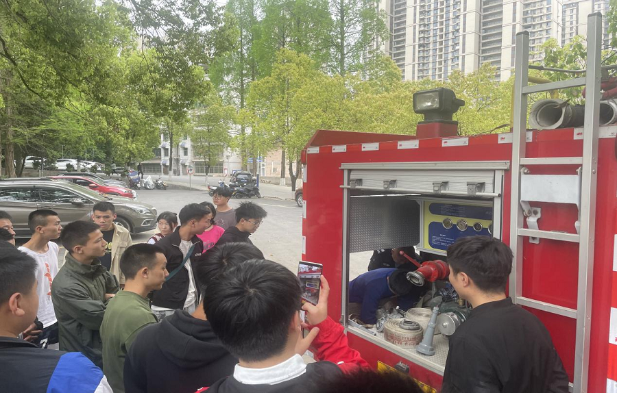 恩施市消防大队李江及保卫处向宣霖、舒吉高结合火灾案例就消防设施设备的识别、干粉灭火器的使用、油锅灭火、消防水带连接、如何逃生等带领同学进行了实操演练。