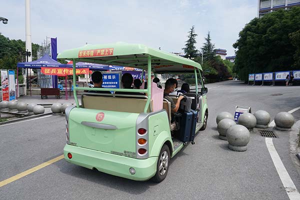 学生乘坐校园观光车前往二级学院报到