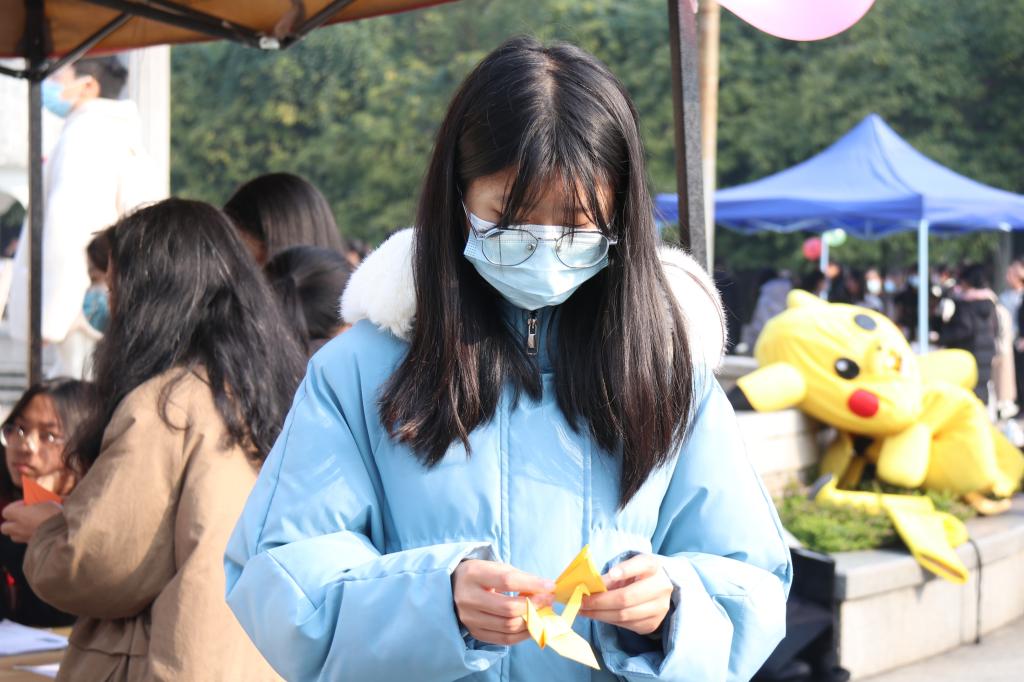 在“为艾而寻”环节中,参与者需要寻找隐藏在指定范围内的题目卡片,并根据卡片上的题目序号回答相应问题,游戏充分考验参与者关于艾滋病知识,并增强其对艾滋病关注意识;在“为艾寄情”环节中,参与者在纸张上匿名写下对预防艾滋病的看法以及自己对防疫抗艾的美好心愿,并折成不同的创意小作品,为关艾、防艾输送温情,传递正能量;在“为艾发声”环节中,参与者全神贯注,竖耳聆听前奏,凭借丰富的歌单储备,迅速猜出歌名并哼唱歌曲,引得现场学生驻足观看。