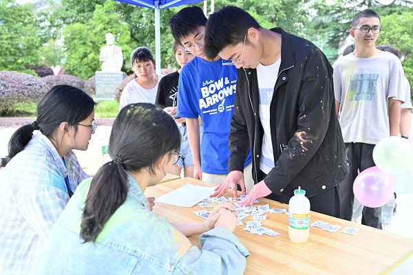 此次活动设立“红橙黄绿青蓝紫彩”8个站点,各个站点设置不同的游戏环节,吸引广大学生参与其中。红色站“口是心非”环节,极其考验参与者的反应能力,参与者两两配合说出文字颜色,配合默契,对答如流。黄色站“听歌识曲”环节,参与者苦思冥想,一首歌曲《欢》引得现场合唱,活动现场气氛活跃。