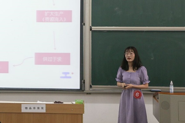 说课组比赛在修远楼教室5A102举行。二号选手胡兴涛根据初一学生的学习特点,设计讲练结合自主探究学习的方法展开二元一次方程定义、例题等递进式的教学,讲解有条不紊,PPT展示充满童趣。四号选手解琳采用直观感性认识学习法,将抽象晦涩的细胞的能量“货币”——ATP形象化、直观化展现在学生面前,其逻辑严密、讲解自然,赢得评委老师一致好评。最终,四号选手解琳以92.4的平均分获得一等奖。