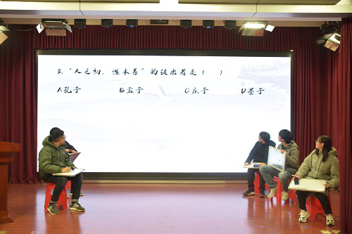 本次比赛涵盖文学常识、经典典故、儒家文化等多个方面,分为“扬帆起航”“谁与争锋”“保驾护航”三个环节,充分考验选手的文学素养。“扬帆起航”环节,面对“程朱理学”“陆王心学”等儒家文化常识及江西诗派“一祖三宗”等问题,五号选手彭启祺沉着冷静,对文学诗词掌握熟练。“谁与争锋”,六号选手马侨远实力非凡,在“朱熹的考亭学派”这一问题上对答如流,赢得观众阵阵掌声。“保驾护航”环节,三位选手旗鼓相当、难分伯仲,展现出各自丰富的文化积累,四号钱恒宇凭借敏捷的反应速度与扎实的文学功底频频抢得答题机会,一举夺魁。