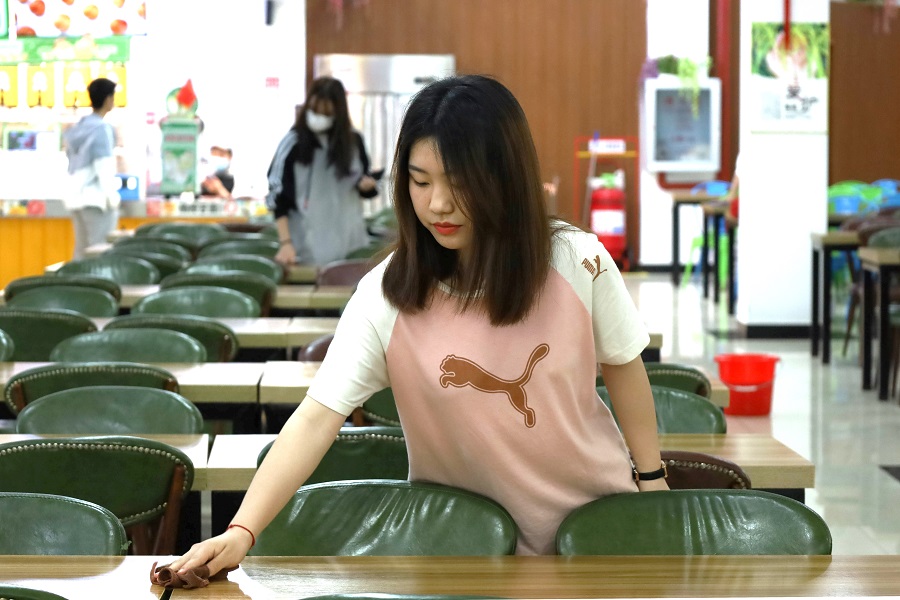 此次活动共分为“我劳动,我光荣”“食堂义务打扫活动”“心灵手巧,变废为宝”“手工制作活动”“寻找最美校园劳动模范”“摄影与书画竞赛”六个环节。在“食堂义务打扫活动”环节中,学生分工明确,在食堂工作人员的指导下,对就餐桌面进行消毒,用抹布和扫把认真擦拭桌面、清扫地面,一丝不苟,做到多层次、全方位的义务大清扫。