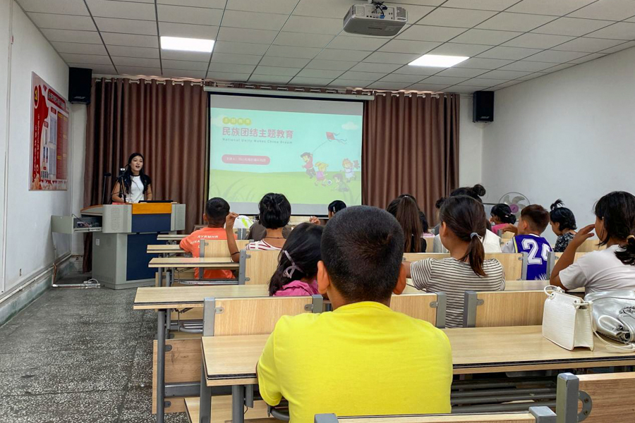 在“红石榴·同心课堂”的讲授中,团队成员再米热姆结合自己求学读书的经历,从中国民族大家庭的构成、民族团结的政策、民族团结的意义以及如何维护民族团结等方面为社区的儿童们带来了一场精彩纷呈的演讲,通过趣味互动、上台体验等形式启发孩子们思考自己在维护民族团结中的角色和责任,加深了孩子对民族团结概念的理解。
