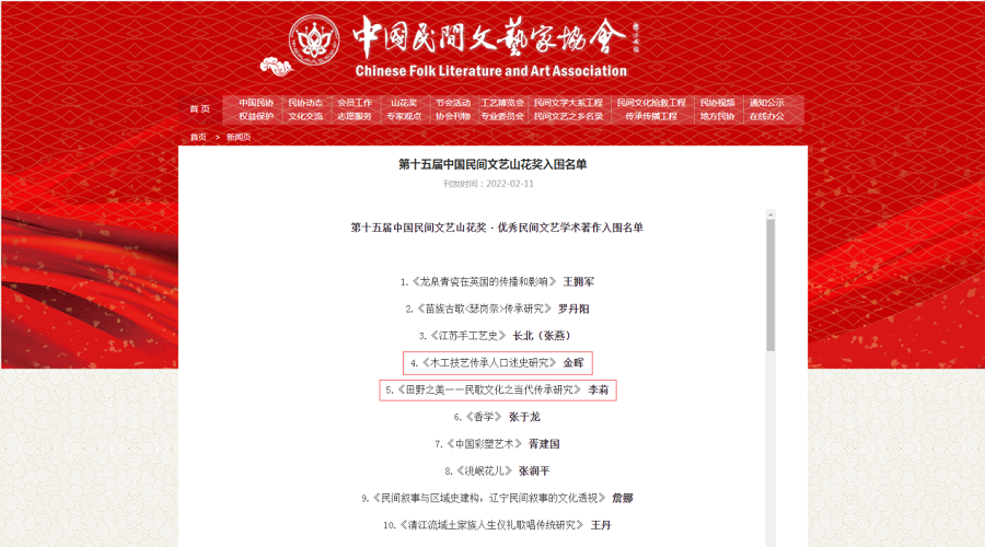 今年2月11日,中国民间文艺家协会公布了第十五届中国民间文艺山花奖入围名单,金晖教授的《木工技艺传承人口述史研究》著作入围“中国民间文艺山花奖·优秀民间文艺学术著作”。