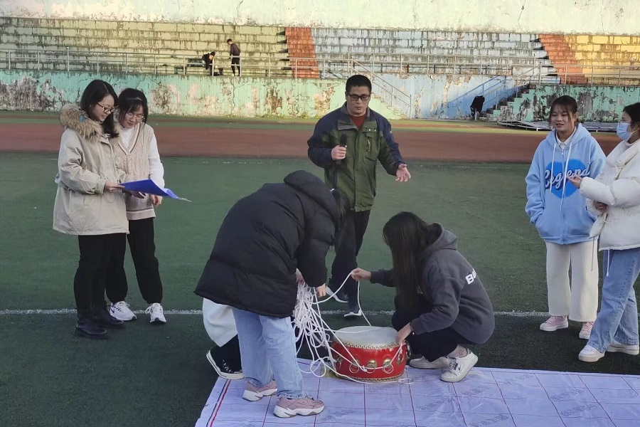 粟登平在操场和同学做素质拓展活动
