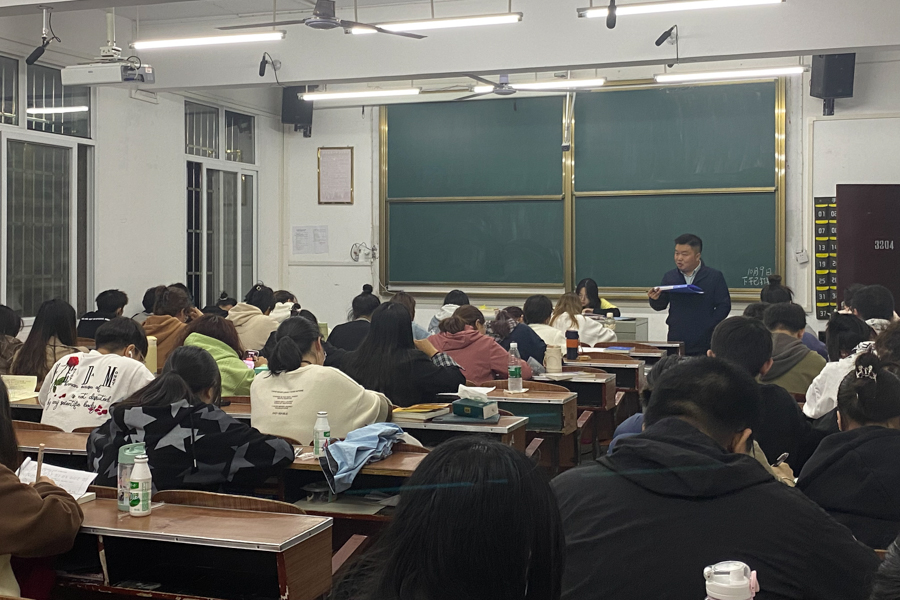 10月9日晚8点,数学与统计学院教学楼里灯火通明,学生们都在教室里学习。魏代俊像往常一样到各个教室查看学生学习情况,走进0221401-02班级,他对即将到大学“分岔路口”的学生说:“孩子们,大三啦,是考研还是找工作自己要有计划啦!如果还是觉得迷茫,可以来找我交流。”