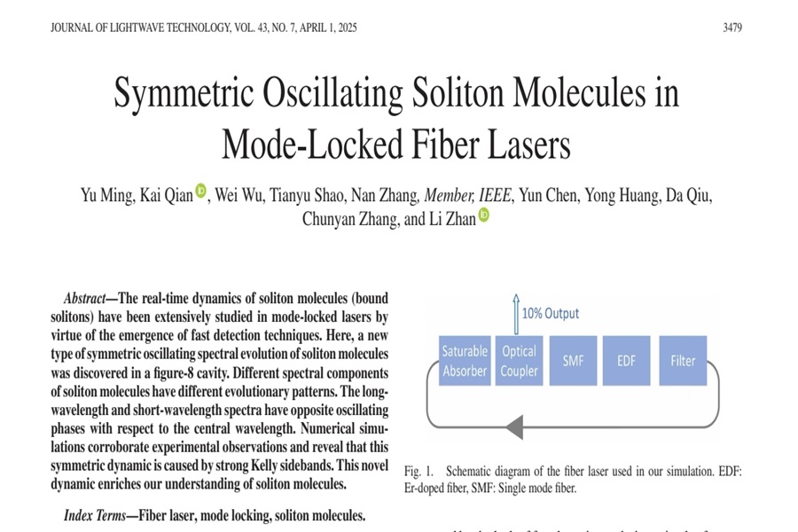 4月1日,永利官网智能科学与工程学院光电信息科学与工程专业2021级学生明雨以第一作者身份在中国科学院一区Top期刊(2023年中国科学院文献情报中心期刊分区表)《光波技术杂志》(《Journal of Lightwave Technology》)(影响因子4.1)发表了题为《锁模光纤激光器中的对称振荡孤子分子》(“Symmetric oscillating soliton molecules in mode-locked fiber lasers”)的学术论文。