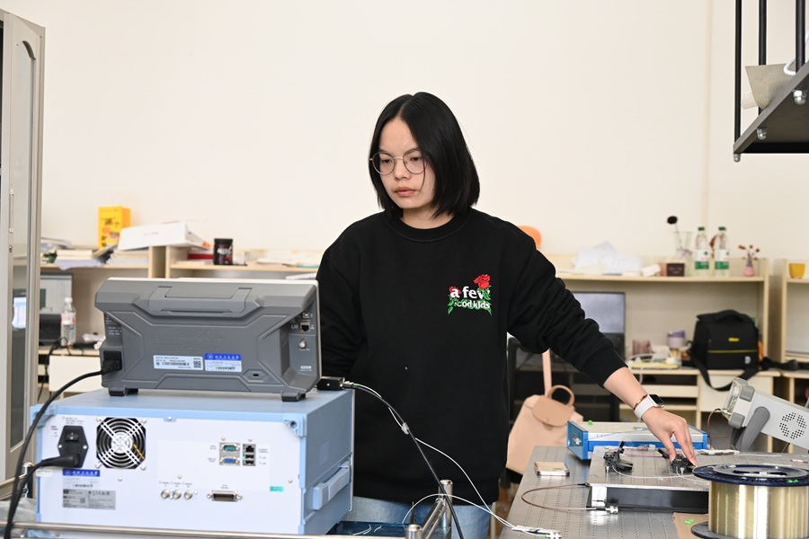 在新校区工程中心实验室里,记者见到了正在熟练地调试光谱仪的明雨。测试光谱、记录每一次数据、画图分析,看似枯燥、琐碎,但她却乐在其中。“那段时间,我们早上七点到达实验室找到光谱仪的锁模状态之后,就一直记录数据到晚上十点半。在做完实验之后,我们画图分析实验现象,也会有做不出来的时候,当时真是‘抓耳挠腮’。导师也会开导我们,他说科学家做实验也有失败的时候,做不出结果,就重新来一遍。”