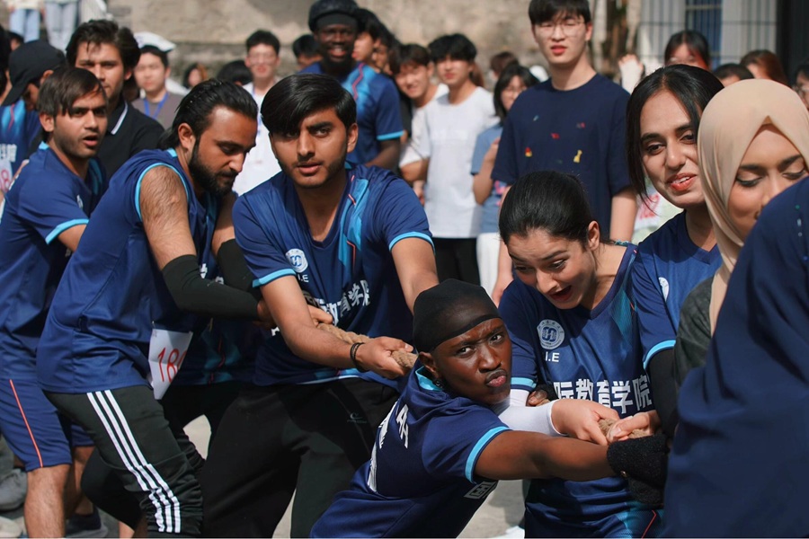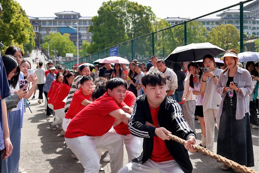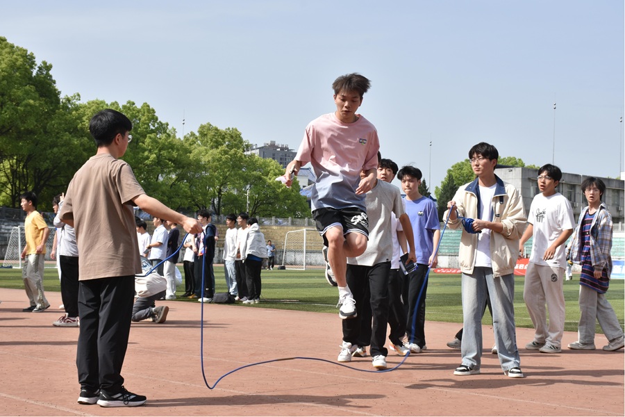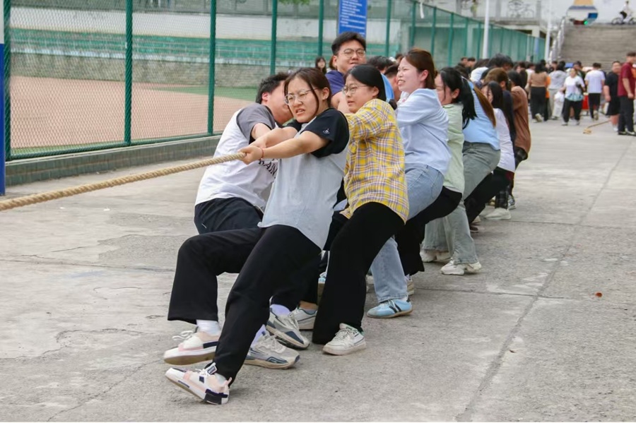 在接力赛中,各代表队凭借精准的交接棒技术和默契配合展开激烈角逐,最后一棒选手在观众的呐喊声中完成逆转冲刺。拔河比赛展现力量与团结的较量,参赛队员紧握麻绳、重心后压,在僵持阶段通过整齐划一的口号凝聚力量。乒羽球台两侧,球员正上演默契攻防,正反手衔接间队友眼神交汇。跳绳场区彩绳翻飞,八人长绳队踩着统一节拍跃入空中,彰显团队协作的无穷魅力。