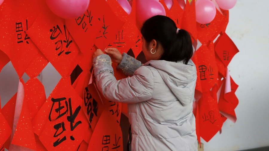 “书法知识竞答”环节,学生对五道书法知识题目进行作答,题目涉及书法发展史、诗词理解、基本常识等内容,学生积极回忆所学书法知识,或冥思苦想,或对答如流,充分感受中华书画文化的博大精深和独特魅力;“福倒了”环节,学生执笔挥斥,用笔画勾勒中华汉字的博大精深,整个过程一气呵成,彰显学生的书法艺术修养和高超技艺;“雅歌投壶”环节,学生聚精凝神,手脑并用,一边吟诗一边投壶,充分考验其协调能力,让学生在温习古诗词的同时体验投壶的乐趣;“寄愿祈福”环节,学生在便利贴上写下新春祝愿,一言一语尽显真切情感,字字充斥着对春节的美好希冀,吸引众多学生驻足观看。