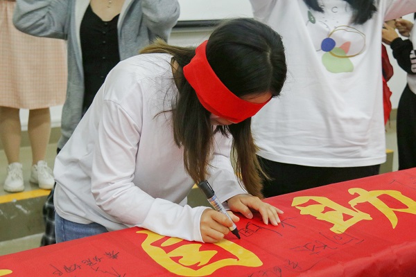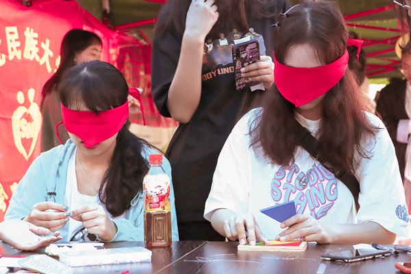助盲实践活动在五环puls开展,活动现场设置“视障者生活体验区”“视障者生活挑战区”“留言展示区”3个区域,体验区的“盲人摸象”,参与者蒙眼扮演视障者,凭借触觉识别动物玩偶,直观感受视障者的世界;挑战区的“拼图”,工作人员用红丝带将参与者的眼睛蒙住,参与者需依靠触觉将打乱的七巧板拼图重新拼成正方形,他们或手忙脚乱,或敏捷迅速;留言区中,参与者写下自己对视障者的祝愿和活动感悟,字句真切感人。