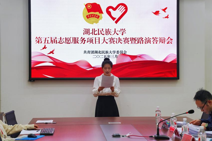 3月27日,第五届志愿服务项目大赛决赛答辩现场,进入决赛的12个团队通过PPT路演全面展示团队项目、背景、内容和成效,对评委提出的项目发展、管理、推广等问题作出答辩,最终“经典润乡土”语言服务队获得一等奖。