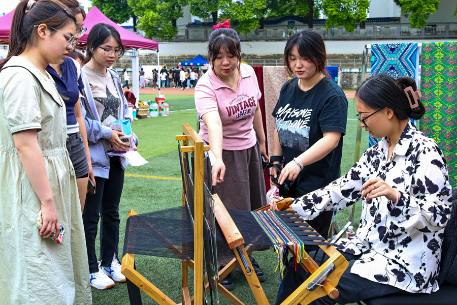 志愿者在第九届民族文化节中指导制作西兰卡普