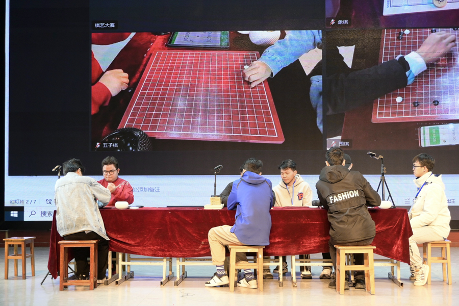 11月18日,体育学院、外国语学院、马克思主义学院、音乐舞蹈学院、文学与传媒学院、美术与设计学院在音舞演播厅联合举办以“执子在民大,‘弈棋’向未来”为主题的棋艺大赛决赛。美术与设计学院团总支副书记唐龙、音乐舞蹈学院团总支副书记方铭,体育学院学生会主席高振宇、外国语学院学生会主席刘馨宇、马克思主义学院学生会主席闫俊担任评委。