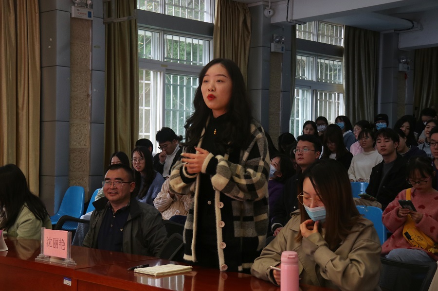 学生提问环节。沈艳丽就“文化本土化”“文论与文体的区别”“如何看待跨文明交流”等问题一一进行解答。她表示,要在比较文学中找到相似点和不同点,全面看待文学问题,促进学术交流。