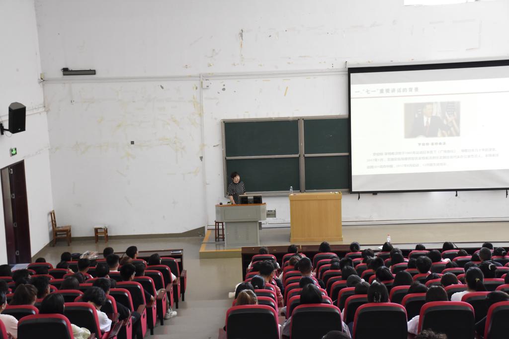 辅导报告会现场本网讯(记者 刘颖)这是一堂精彩的思政课,是一节鲜活的党史课,是一次生动的辅导报告,也是一场特别的开学第一课。9月9日下午,学校党委宣传部和学生工作处联合组织的“学习贯彻习近平总书记‘七一’重要讲话精神宣讲报告会”2021级新生专场在学校修远楼5A207举行。恩施州党史学习教育宣讲团成员、学校马克思主义学院副教授周传和为300多名新生代表作了专题辅导报告。宣讲报告会上,周传和以“请党放心、强国有...