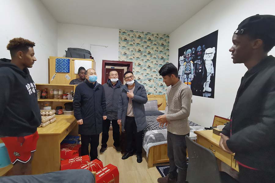 1月26日上午,壬寅虎年新春佳节来临之际,学校党委常委、副校长李军率队看望慰问寒假期间留校的外籍教师和留学生,为他们送上学校的亲切关怀和新春祝福。李军一行先后来到外籍教师宿舍和留学生公寓,向来自美国、日本、巴基斯坦、加纳、坦桑尼亚、赞比亚、卢旺达、博茨瓦纳等国的外籍教师和留学生表达了诚挚的问候,并详细询问了他们在学校的工作、学习及生活情况。李军(左三)走访慰问留学生来自美国的外籍教师Stephen、Phela...