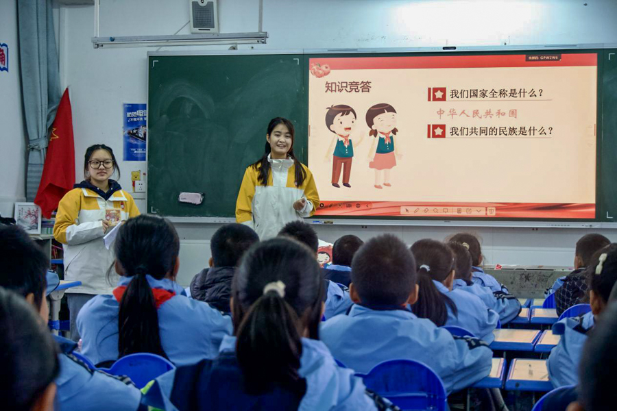 12月5日,学校“红石榴”宣讲团走进恩施市芭蕉侗族乡中心小学开展铸牢中华民族共同体意识宣讲活动,20名宣讲团成员为芭蕉小学500余名学生开展了以“我们伟大的民族精神”为主题的宣讲活动。各组以红彤彤的石榴为例,从石榴的形状、颜色、文化意蕴等方面,生动形象地为学生讲解“红石榴”宣讲团名称由来,让学生深刻理解“各民族要像石榴籽一样紧紧抱在一起”的意义。活动现场宣讲团成员为学生讲解五星红旗、国徽、国歌的来源及...