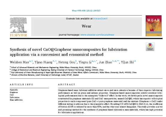 近期,智能科学与工程学院机械电子工程专业2018级本科生满伟珍同学作为第一作者在国际机械工程领域期刊《Wear》(《磨损》)2022年总第498-499期发表题为《Synthesis of novel CuO@Graphene nanocomposites for lubrication application via a convenient and economical method》的研究论文。《Wear》是国际知名出版社Elsevier旗下的老牌摩擦学专业期刊,专注于机械磨损、润滑、表面工程等领域,已成立65年。2021年影响因子4.6...